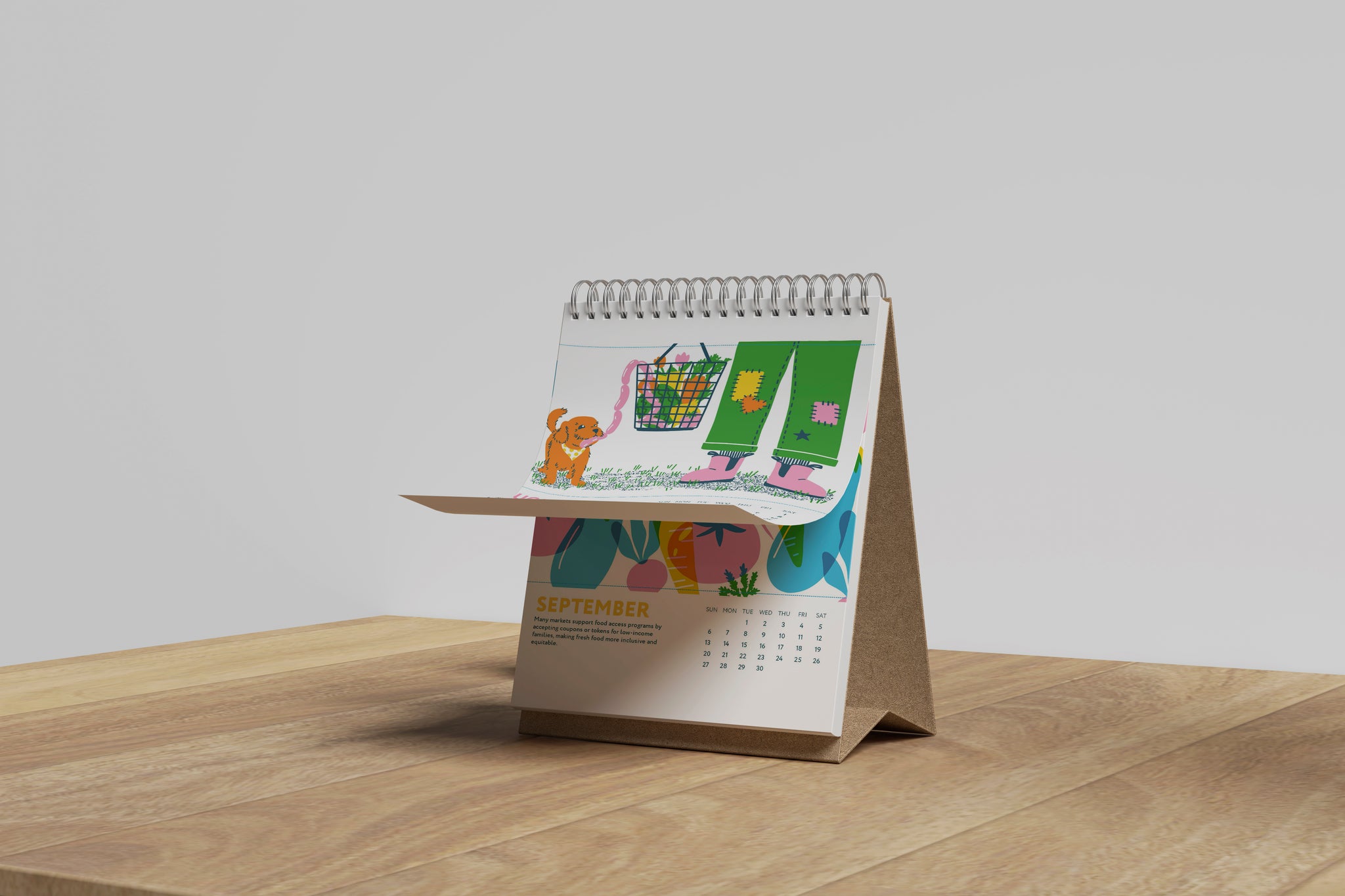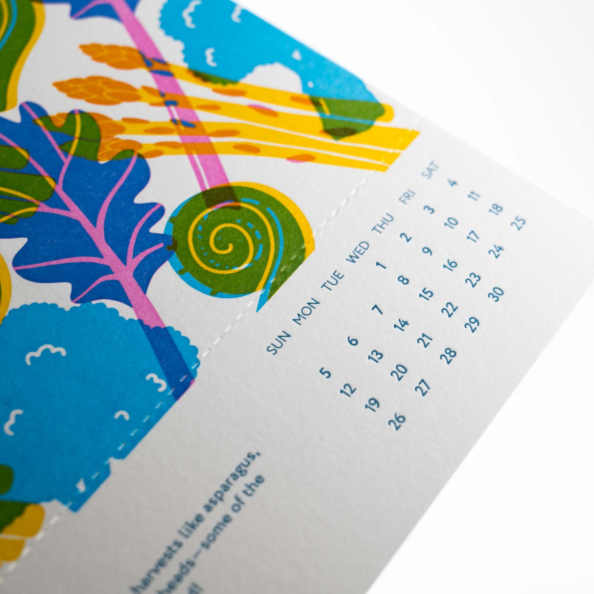 Each calendar is meticulously designed and printed on high-quality FSC-certified and recycled cardstock using plant-based inks. These pages also include a fun fact about farmers markets.