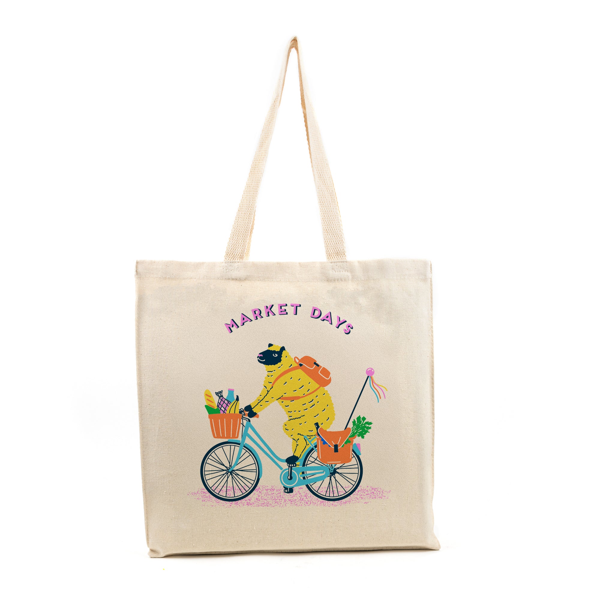 Going to the market? Don't forget your tote bag! Featuring a fun illustration of a sheep biking back from the market with a basket full of veggies, this tote is printed on organic cotton with love for you with water-based inks.